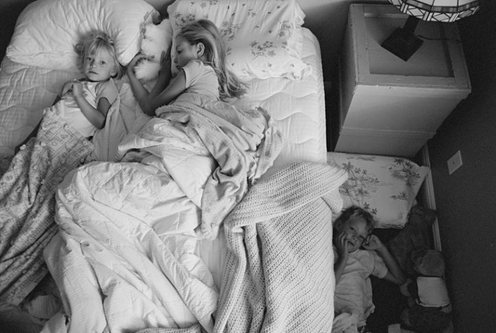 Standing on the foot of the bed to get a good angle on all three kids worked well here. Henri Cartier-Bresson said that photography made up of two decisions:
