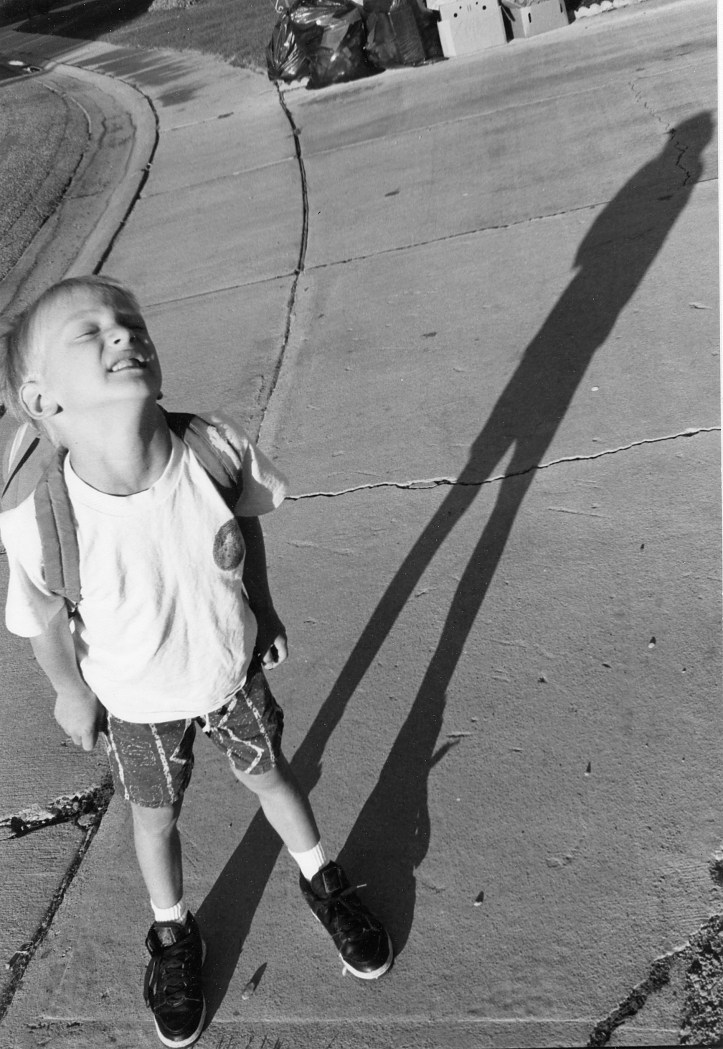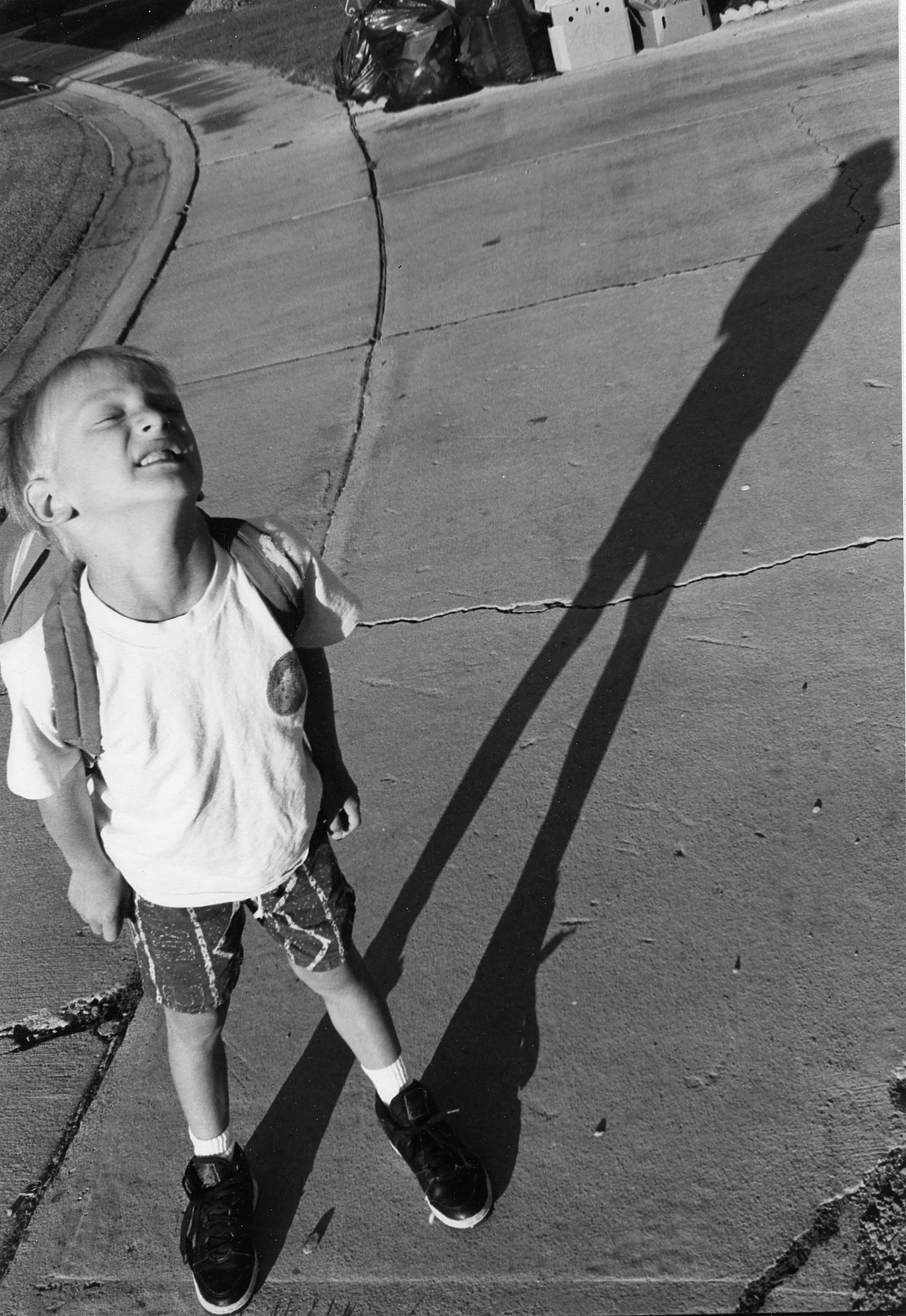 Zach and his shadow from a convienent “V” for our eye to dance up the frame and back down. I printed the image in the darkroom at Capital High School in 1990. I was careful to put his shoe, head and shadow right at the edge to reinforce the strong diagonal elements.