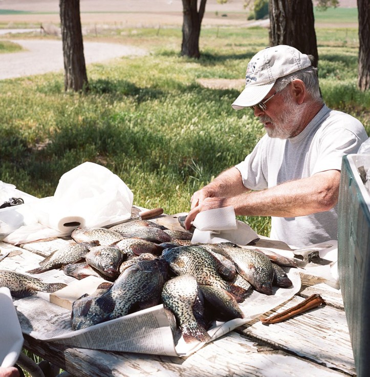 He called us over to a picnic table and unzipped a large canvas bag. He dumped 50 crappie out on the table. They were mostly dead but still flopping around on the table. The boys gasped. It’s surprising to see a pile of half-dead fish.Emerson laid one out on his wooden fillet board and held it down with a paper towel.