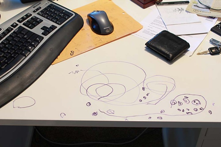 I have a white desk with a mug full of pens. In that mug is a Sharpie permanent marker. Grace snatched up that pen and decorated my desk. You can tell that she spent some time there. The large gestures of swirling marks were probably her first move. Then the details of circles and little faces were her last bits of detailing.